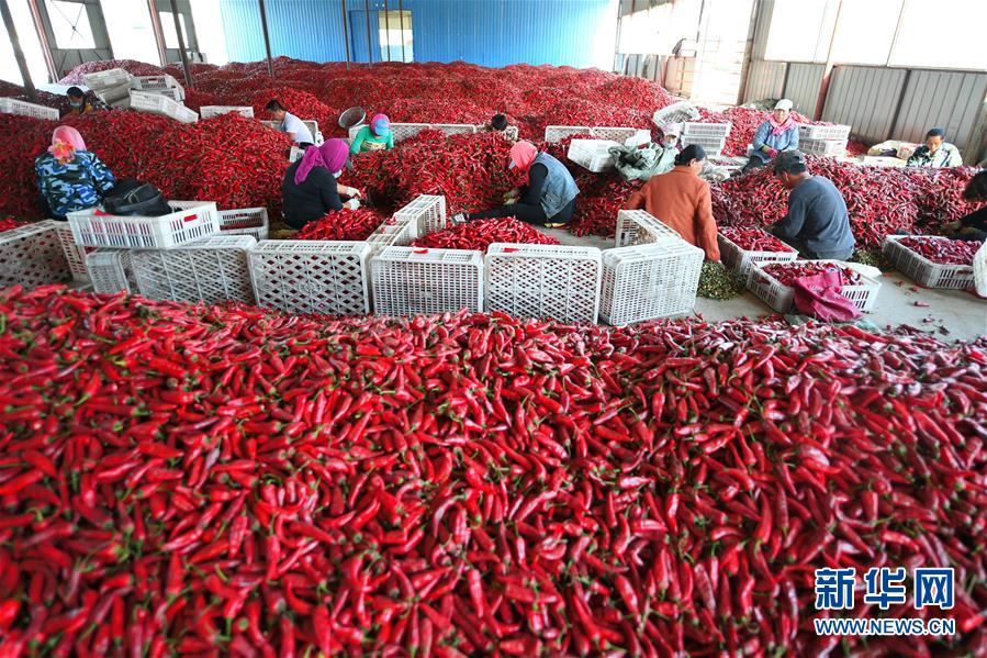 9月19日,在吉林省白城市通榆縣,農(nóng)民在分揀收獲的辣椒。  新華社記者 張楠 攝