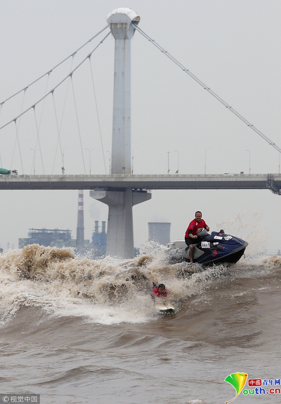 杭州錢江江面上,沖浪弄潮兒英姿颯爽。