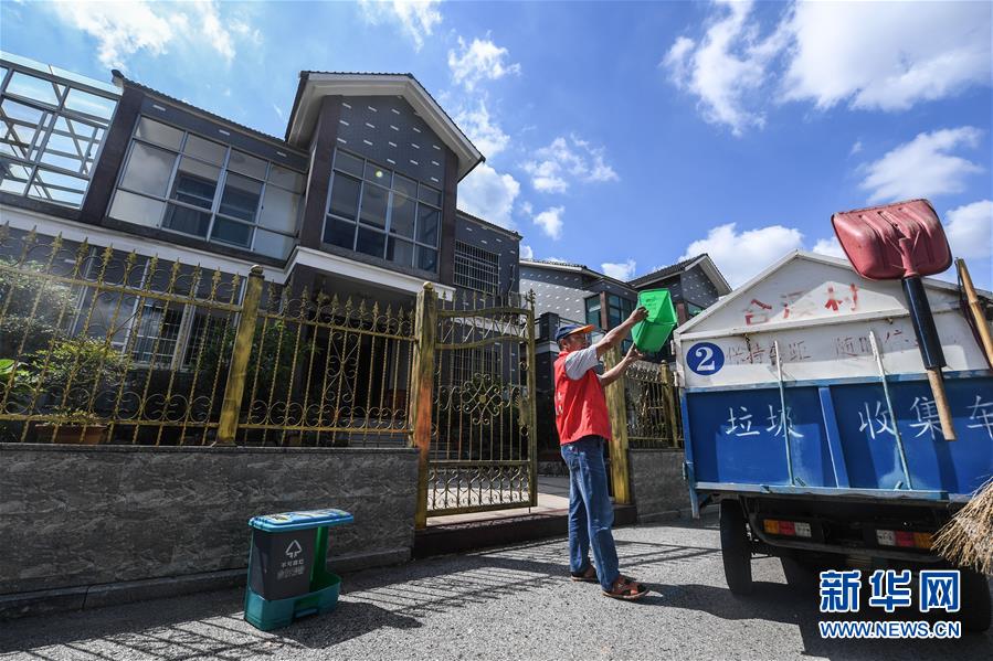 9月27日,小浦鎮(zhèn)合溪村垃圾分類清運(yùn)員符正芳在清運(yùn)村民門口的分類垃圾桶,同時(shí)他還要用手機(jī)上的垃圾分類APP進(jìn)行掃碼簽到,確保每天每戶清掃到位。從9月初開(kāi)始,浙江省長(zhǎng)興縣小浦鎮(zhèn)推廣使用手機(jī)垃圾分類智能管理平臺(tái)。通過(guò)這款A(yù)PP可以進(jìn)行村民垃圾分類情況打分、清運(yùn)員每日簽到、監(jiān)督員巡查等,并能即時(shí)生成農(nóng)戶垃圾分類“成績(jī)單”,所有農(nóng)戶均可通過(guò)APP查詢垃圾分類排行榜,既方便又環(huán)保。新華社記者 徐昱 攝