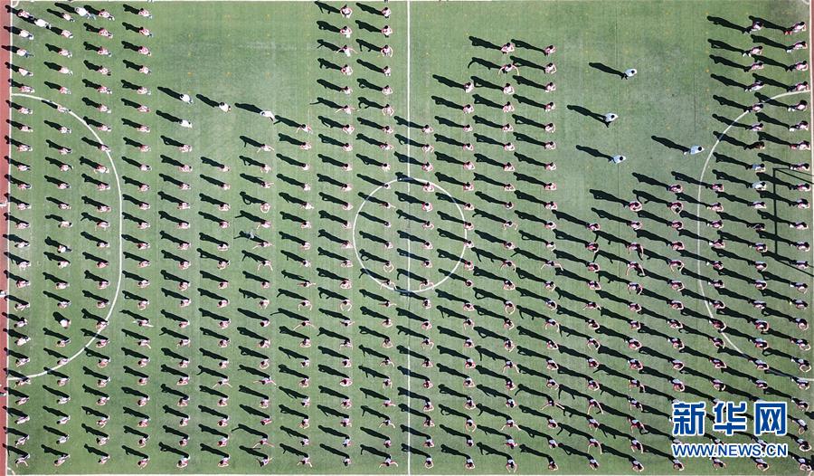 在小崗村小崗學校,學生們在體育展示課上做操(9月27日無人機拍攝)。 新華社記者 才揚攝