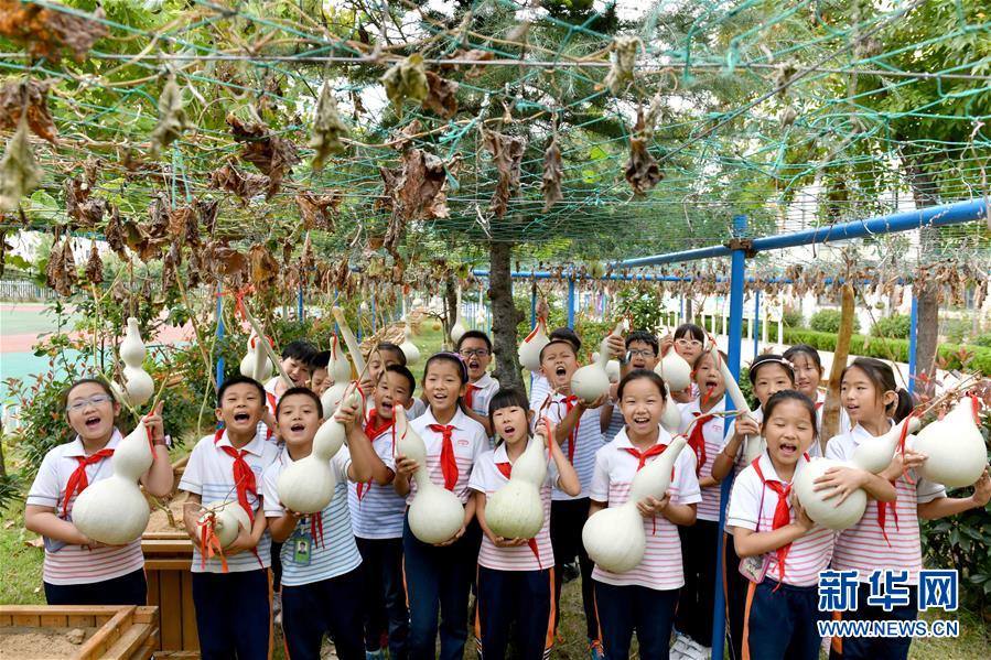 9月29日,在威海市經(jīng)濟(jì)技術(shù)開發(fā)區(qū)新都小學(xué),學(xué)生展示采摘的葫蘆。新華社記者郭緒雷攝