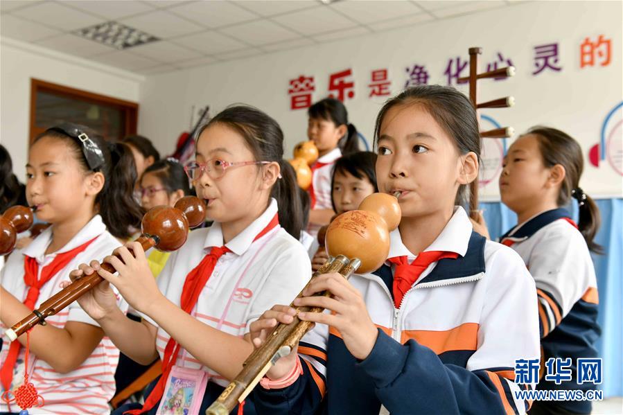 9月29日,在威海市經(jīng)濟(jì)技術(shù)開發(fā)區(qū)新都小學(xué),學(xué)生們吹奏葫蘆絲。新華社記者郭緒雷攝
