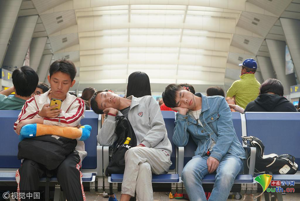 2018年10月1日,兩名旅客在北京南站內(nèi)候車時(shí)打盹。當(dāng)天是國(guó)慶假期首日,北京南站迎來客流高峰。此前,據(jù)北京鐵路局預(yù)計(jì),國(guó)慶黃金周將發(fā)送旅客1168萬人,同比增加19.9萬人。其中10月1日為出行高峰日,預(yù)計(jì)當(dāng)天發(fā)送旅客143萬人,同比增加4.7萬人。圖片作者:張興龍