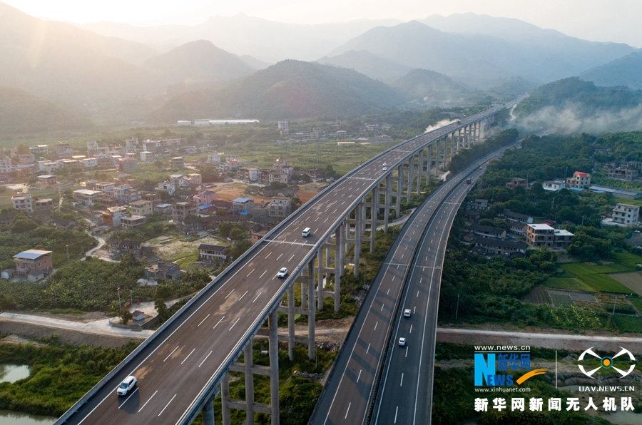 這是夕陽中的廈蓉高速南靖金山停車區(qū)附近路段。高處為新建的下行線,減低了坡度。低處為原來的長下坡,將改造成上行線(無人機拍攝)。新華網(wǎng) 肖和勇 攝