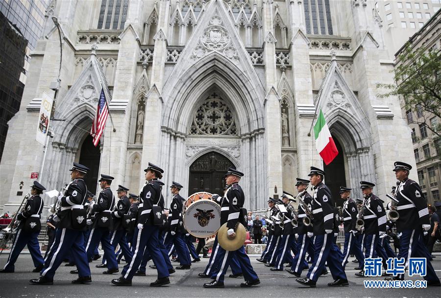 10月8日,在美國(guó)紐約曼哈頓第五大道,美國(guó)西點(diǎn)軍校樂隊(duì)參加哥倫布日游行。 新華社記者王迎攝