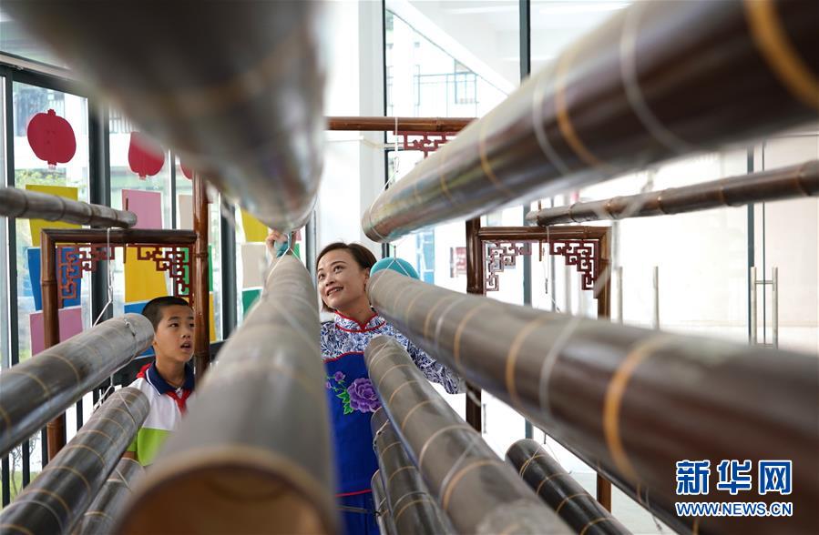 10月8日,崇義縣竹樂樂團(tuán)的演員在教學(xué)生演奏竹鼓。 近年來,江西省崇義縣思源實(shí)驗(yàn)學(xué)校定期開設(shè)竹樂課,邀請崇義縣竹樂樂團(tuán)的演員教授學(xué)生演奏竹排琴、竹板琴等竹樂樂器,激發(fā)學(xué)生了解傳統(tǒng)文化的熱情。 新華社記者胡晨歡攝