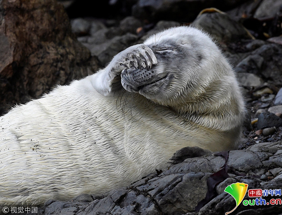 中國青年網(wǎng)北京10月9日電 當(dāng)?shù)貢r間2018年10月8日,英國彭布羅克郡,一只大西洋海豹幼崽躺在海邊礁石上。海豹幼崽出生時都有毛茸茸的白色非防水皮毛,它們會在第四周蛻皮。