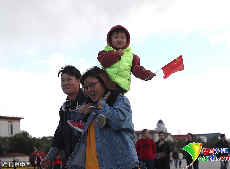 北京冷空氣來襲 游客紛紛著秋冬裝游覽天安門