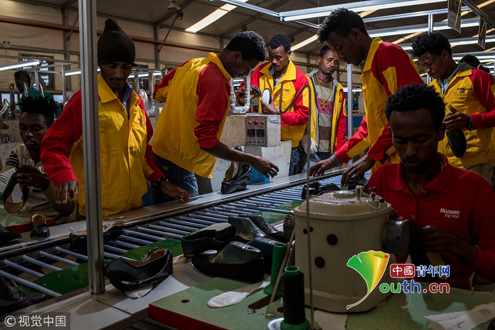 華堅鞋廠的制鞋流水線。據華堅集團官網介紹,每年約240萬雙包括NineWest、GUESS 在內的品牌女鞋帶著“Made In Ethiopia”(埃塞俄比亞制造)的標簽,從這里流向美國市場。