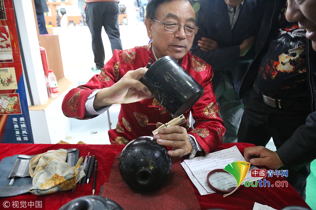 2018年10月14日,山東濟南,高新會展中心濟南文博會現(xiàn)場,張務(wù)福老先生在黑陶鼎上刻字。