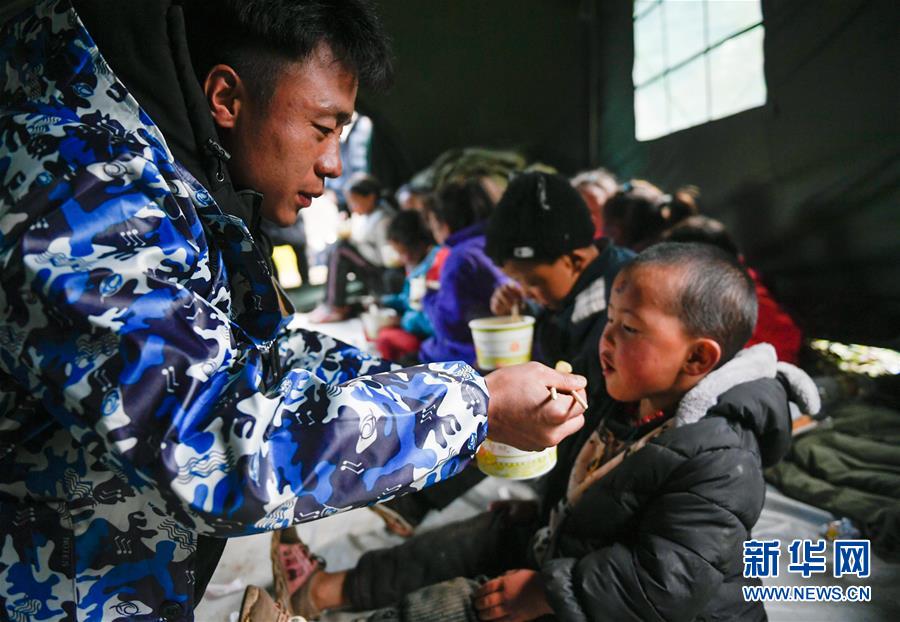 波羅鄉(xiāng)一名工作人員在臨時(shí)過(guò)渡安置點(diǎn)帳篷內(nèi)給一名兒童喂飯(10月14日攝)。  新華社記者 劉東君 攝