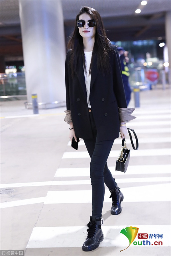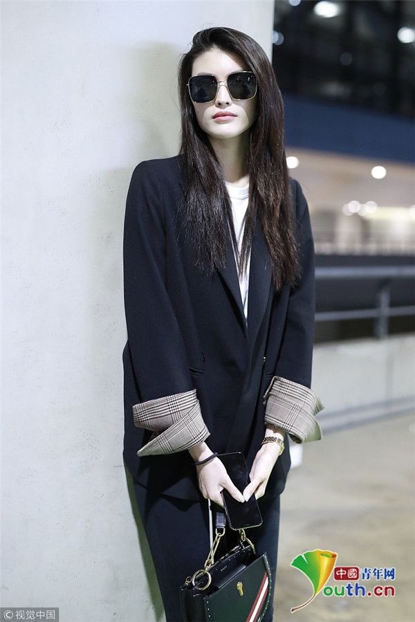 2018年10月15日,上海,何穗亮相機場。她身穿深色西裝搭配黑色緊身褲大秀超模身材,簡約造型依舊高級感十足,輕撩秀發(fā)散發(fā)女人味。