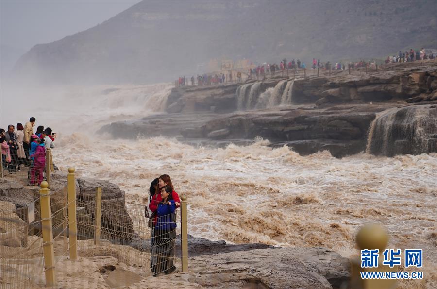 10月17日,游客在位于陜西宜川縣的黃河壺口瀑布岸邊合影。  新華社記者邵瑞攝