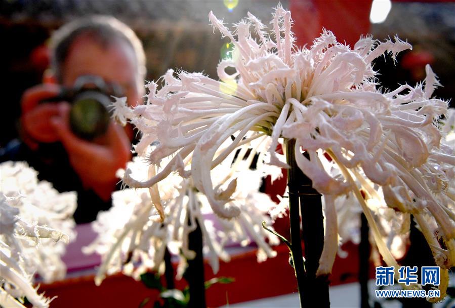 10月17日,游客在開封清明上河園內(nèi)拍攝展出的菊花。重陽時節(jié),各色菊花競相綻放,把古都開封裝點得分外秀美,吸引眾多游客前來觀賞游玩。  新華社記者 李安 攝