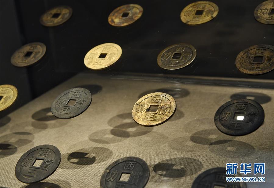 這是在四川博物院展出的“西王賞功”錢幣(10月21日攝)。 當日,由四川省文化廳、四川省文物局、眉山市人民政府主辦的“江口沉銀——四川彭山江口古戰(zhàn)場遺址考古成果展”在四川博物院開幕。此次展覽共展出文物521件,展期將持續(xù)至2019年1月18日。四川彭山江口古戰(zhàn)場遺址是2017年度全國十大考古新發(fā)現(xiàn)之一,共發(fā)現(xiàn)文物42000余件。 新華社記者劉坤攝
