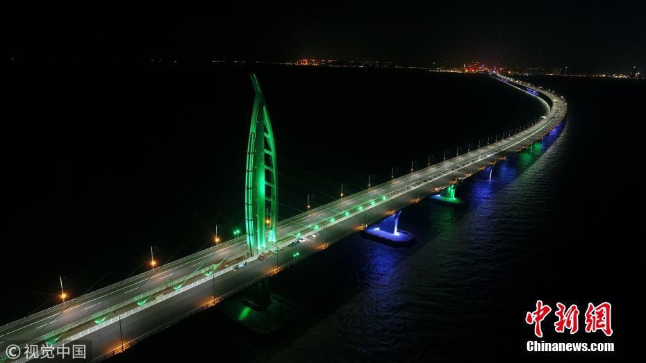 2017年12月30日,珠海,港珠澳大橋九洲航道橋、江海直達船航道橋燈火璀璨,在五顏六色的裝飾燈映襯下,整座大橋熠熠生輝。王榮 攝 圖片來源:視覺中國