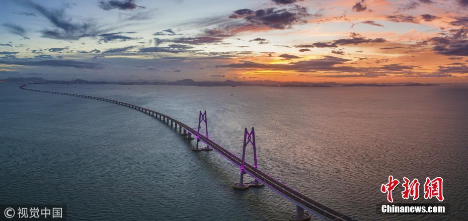 2018年7月18日,珠海,滿天紅霞,亮燈后的港珠澳大橋跨立在伶仃洋上,進(jìn)入通車前的最后準(zhǔn)備。張由瓊 攝 圖片來源:視覺中國