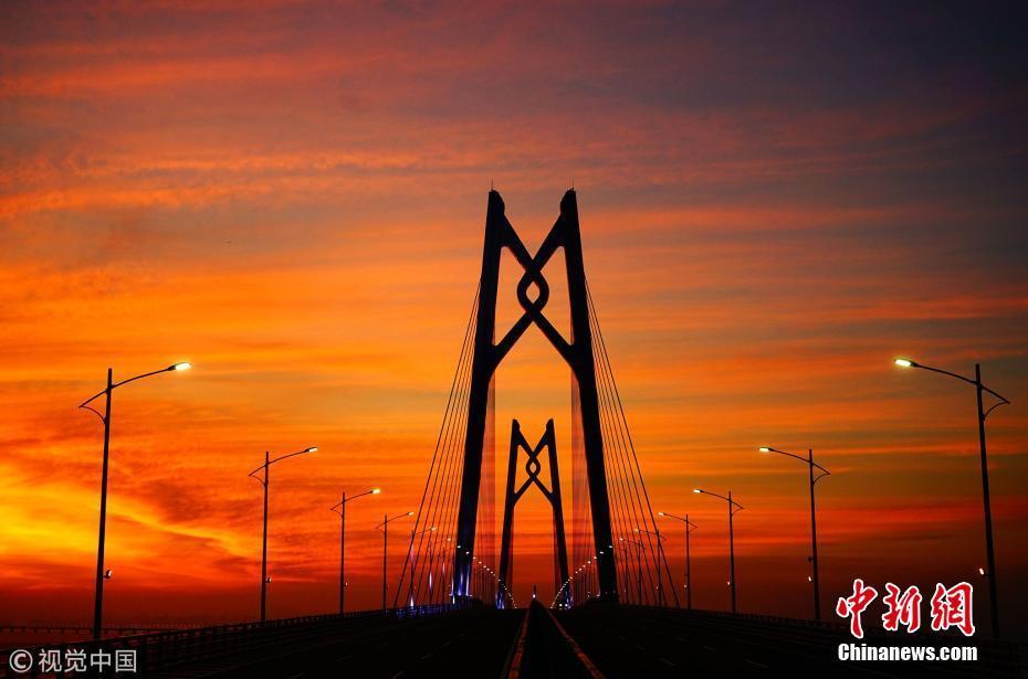2018年1月15日,廣東珠海,記者再上港珠澳大橋。夕陽(yáng)西下,港珠澳大橋在晚霞的映照下顯得格外壯麗秀美。于燕敏 攝 圖片來(lái)源:視覺(jué)中國(guó)