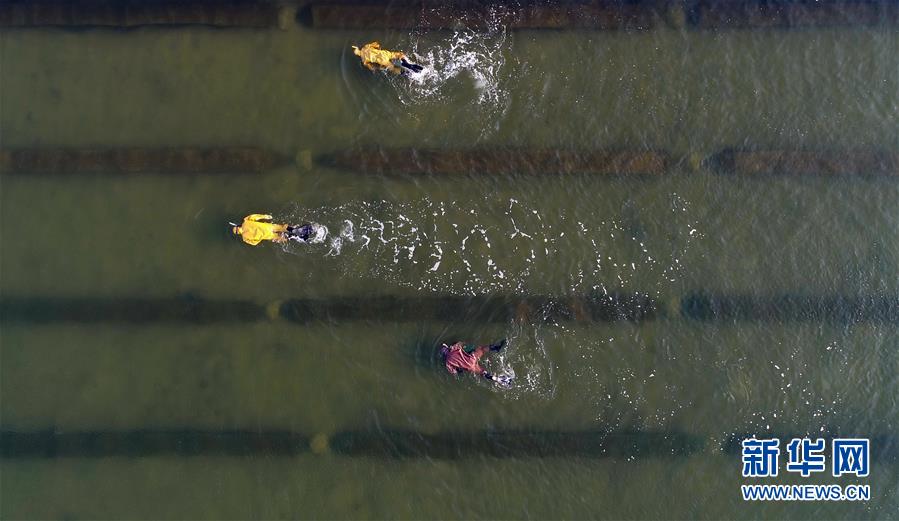 10月22日,樂亭縣姜各莊鎮(zhèn)二節(jié)村海參養(yǎng)殖基地的工人在捕撈海參(無人機拍攝)。 時下,正值渤海灣地區(qū)海參收獲時節(jié),河北省樂亭縣的海參養(yǎng)殖戶忙著捕撈海參,供應各地市場。據(jù)介紹,該縣海域水質(zhì)優(yōu)良、氣候適宜,是海參養(yǎng)殖的理想場地,目前發(fā)展池塘造礁養(yǎng)殖海參面積6萬畝,年產(chǎn)鮮活海參6000多噸,年產(chǎn)值2億多元。  新華社記者 楊世堯 攝