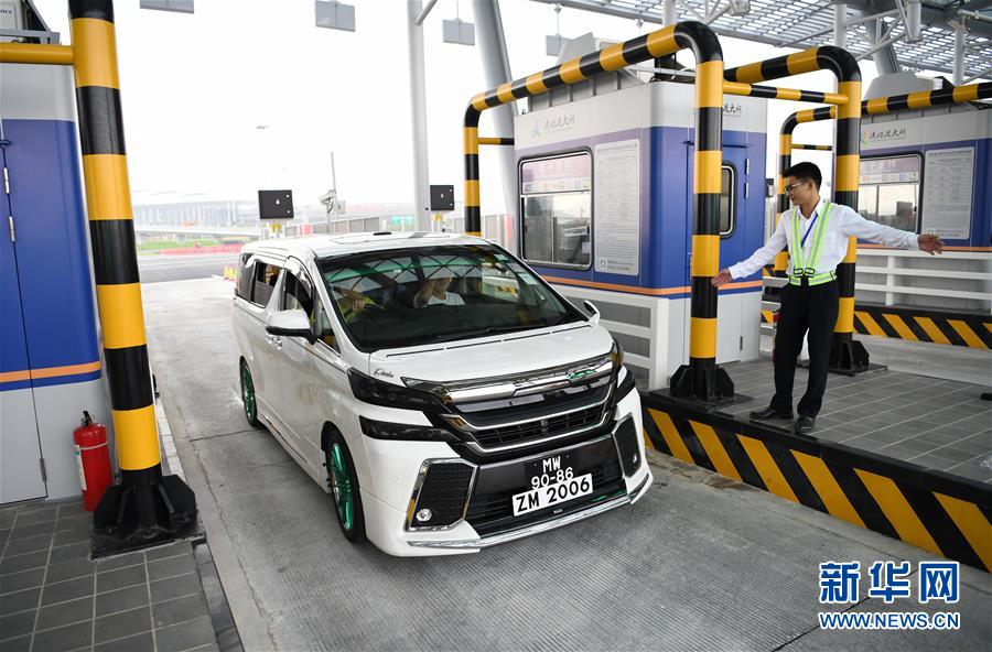 10月24日,首輛私家車在澳門口岸離境車道上通關(guān)。當(dāng)日9時,港珠澳大橋正式通車。 新華社記者張金加攝
