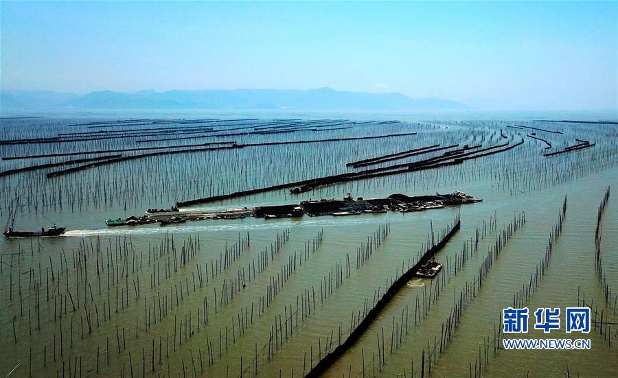 10月24日,福建莆田蔣山村村民在海上收割紫菜(無(wú)人機(jī)拍攝)?! ⌒氯A社記者姜克紅 攝
