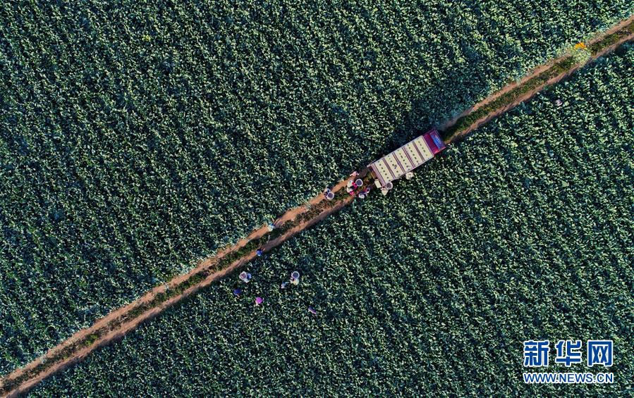 10月29日,樂(lè)亭縣馬頭營(yíng)鎮(zhèn)馬頭營(yíng)村的農(nóng)民在收獲菜花(無(wú)人機(jī)拍攝)。 新華社記者楊世堯攝