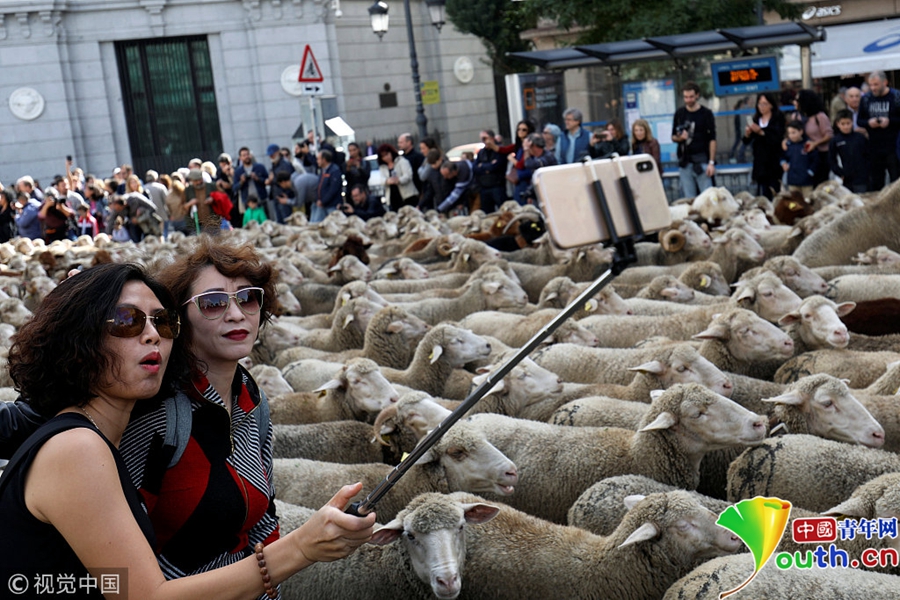 西班牙牧羊人驅(qū)趕羊群穿越馬德里 羊群進(jìn)城“參觀”