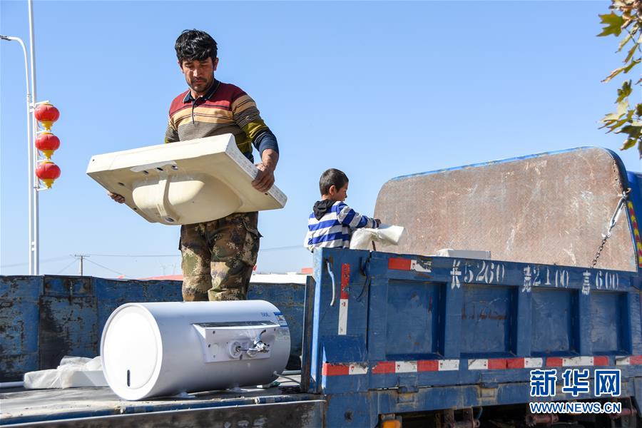10月28日,買合肉甫·木拉吧在小兒子的幫助下裝運(yùn)貨物。 新華社記者 關(guān)俏俏 攝