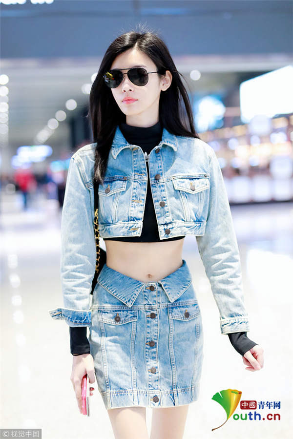 奚夢瑤一身帥氣牛仔裝 露細(xì)腰長腿顯好身材