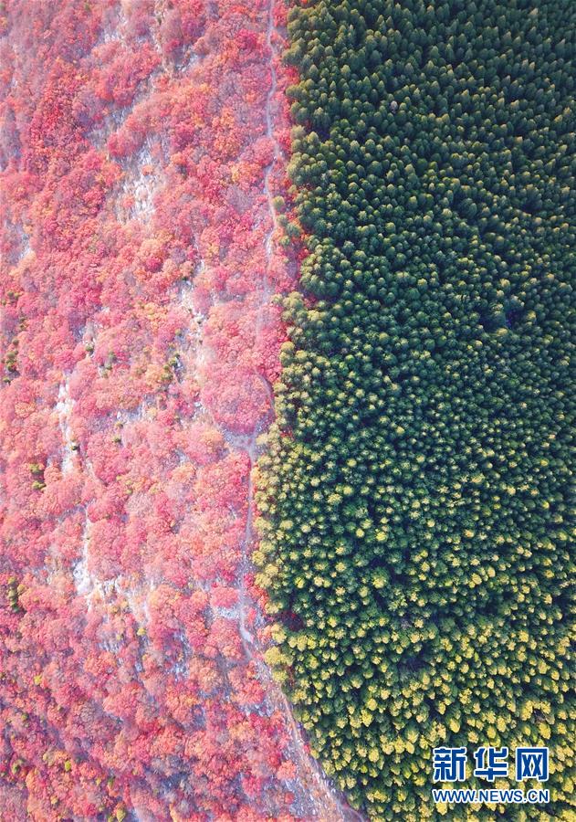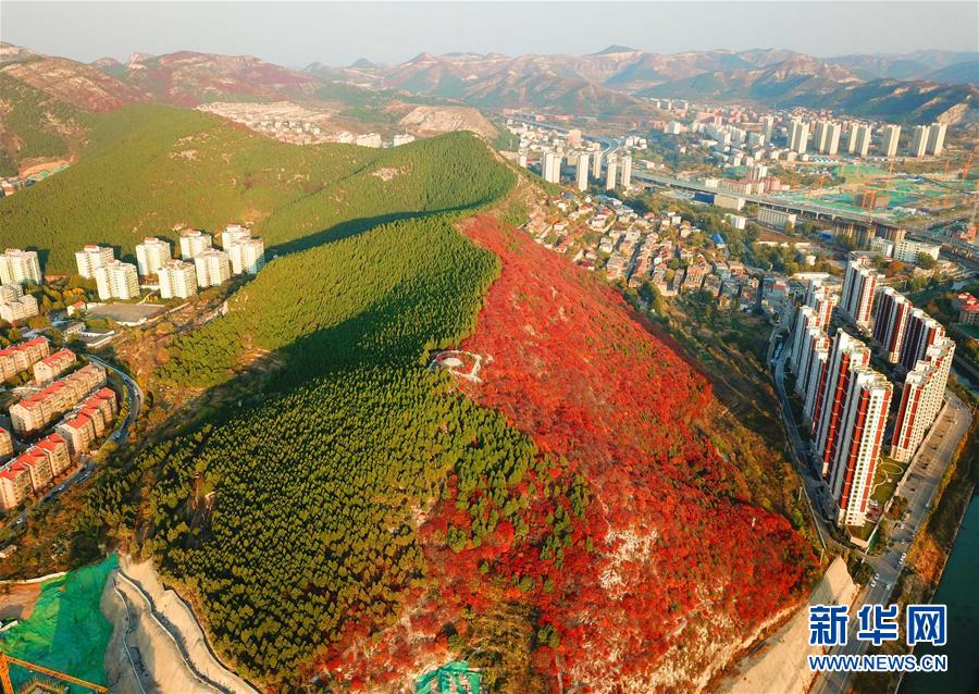 深秋時(shí)節(jié),山東濟(jì)南楔子山山脊兩邊種植的植被形成“一山雙色”景觀,令人稱奇。