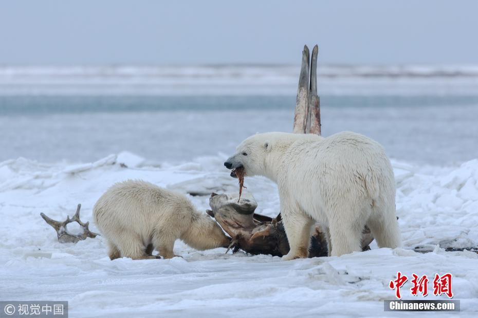 北極熊媽媽帶幼崽覓食 熊寶寶抱“大骨棒”擺拍