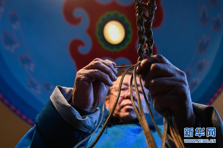 10月31日,在內(nèi)蒙古自治區(qū)通遼市科爾沁左翼后旗,套格敦白乙在工作室里編織馬肚帶。新華社記者劉磊攝