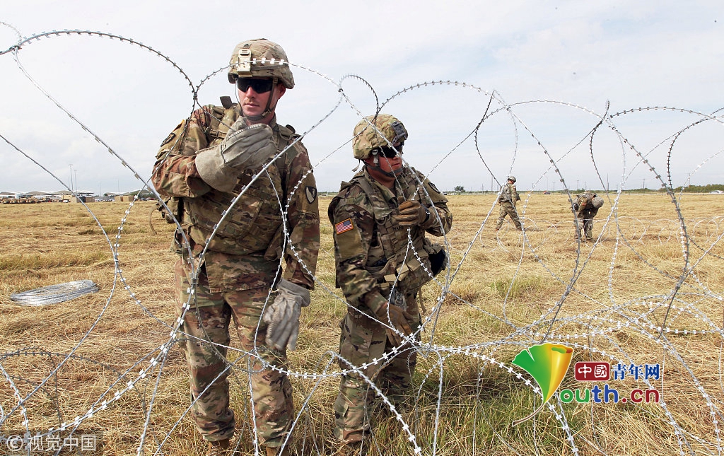 當(dāng)?shù)貢r間2018年11月4日,美國得克薩斯州Donna,美國士兵在美國與墨西哥邊境的入境口岸附近鋪設(shè)鐵絲網(wǎng)圍欄,應(yīng)對中美洲移民壓境。