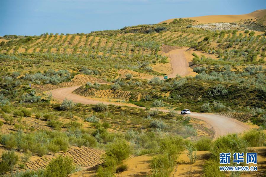 車輛在銀肯塔拉沙漠綠洲自然生態(tài)旅游區(qū)中穿行(6月7日攝)。