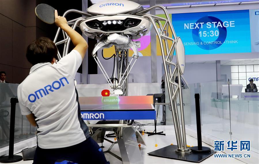 11月5日,一名工作人員在歐姆龍展臺(tái)演示與機(jī)器人進(jìn)行乒乓球?qū)?zhàn)。新華社記者 方喆 攝