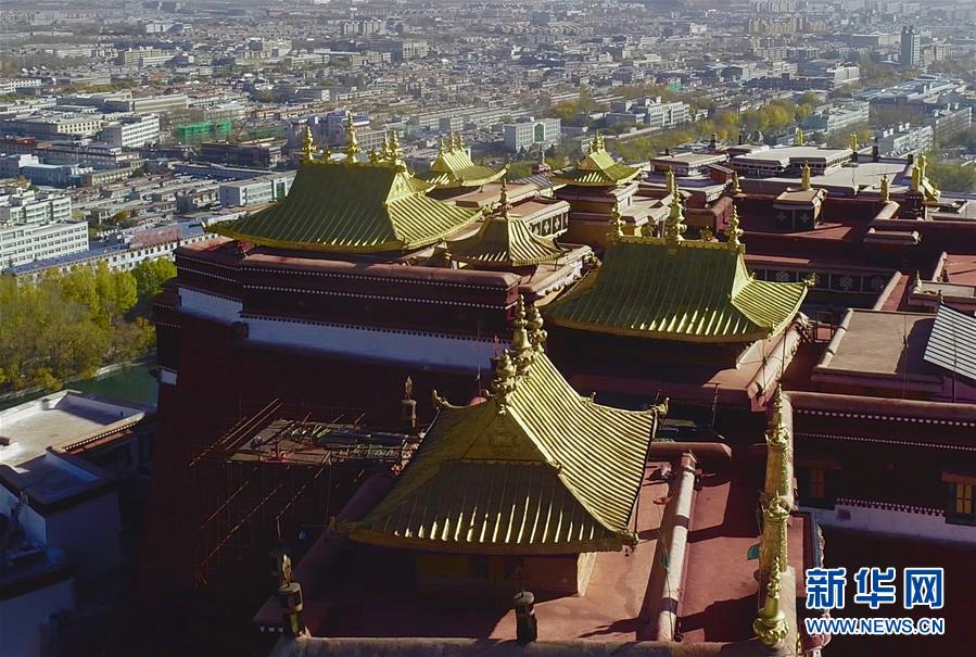 修繕后的布達(dá)拉宮金頂群(11月7日無人機(jī)拍攝)。新華社記者普布扎西 攝