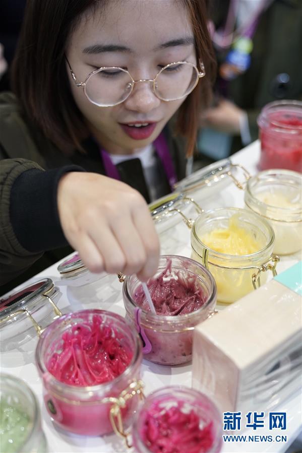 11月7日,在進博會食品及農(nóng)產(chǎn)品展區(qū)的一家俄羅斯企業(yè)展位,一名參觀者品嘗混合純天然果汁的蜂蜜產(chǎn)品。 新華社記者 沈伯韓 攝