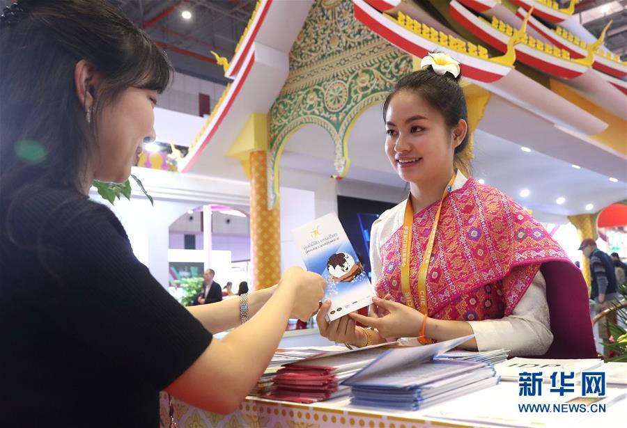 11月7日,在首屆中國國際進口博覽會上,老撾展區(qū)工作人員(右)在向參觀者介紹情況。新華社記者 陳飛 攝