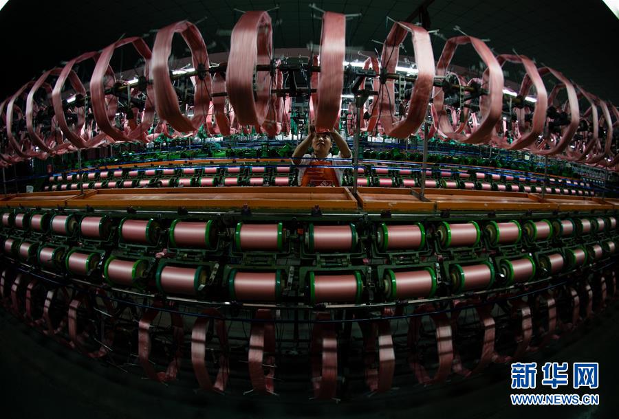蘇州市吳江區(qū)盛澤鎮(zhèn)一家絲綢公司的工人在車間進(jìn)行絡(luò)絲作業(yè)(2017年5月20日攝)。  新華社記者 李響 攝