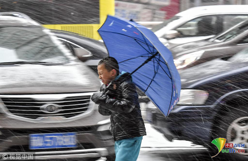 2018年11月12日,持續(xù)濃霧天氣的新疆烏魯木齊市,又迎來一場雨雪天氣,氣溫隨之驟降。圖為一名男孩打著雨傘與風(fēng)雪“抗?fàn)帯?。圖片作者:劉新