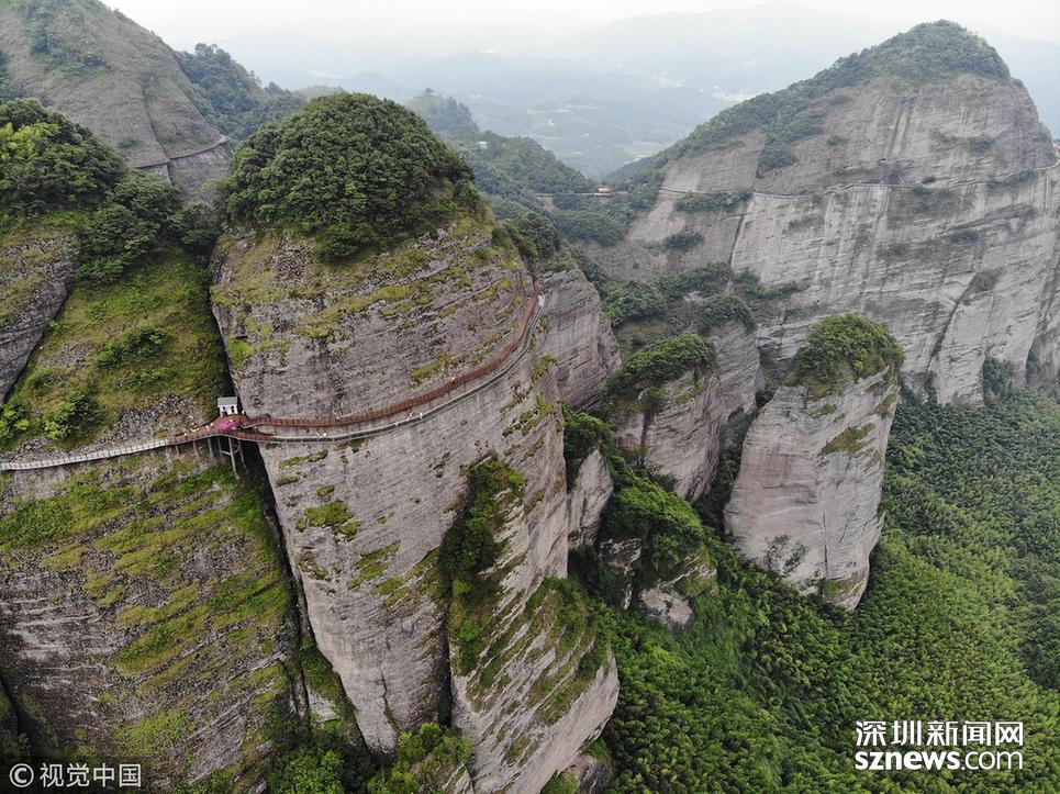 深圳新聞網(wǎng)訊 2018年6月19日,航拍江西贛州南武當(dāng)山百米高空玻璃棧道。棧道緊貼峭壁,在懸崖之上凌空蜿蜒穿行,猶如一條玉龍盤旋在綠林石海之中。 南武當(dāng)山位于江西最南端的龍南縣武當(dāng)鎮(zhèn)境內(nèi),景區(qū)核心面積達到13.5平方公里,擁有99座千姿百態(tài)的巍峨石峰,丹霞地質(zhì)風(fēng)貌突出,連綿十里,被稱為“武當(dāng)十里畫廊”。