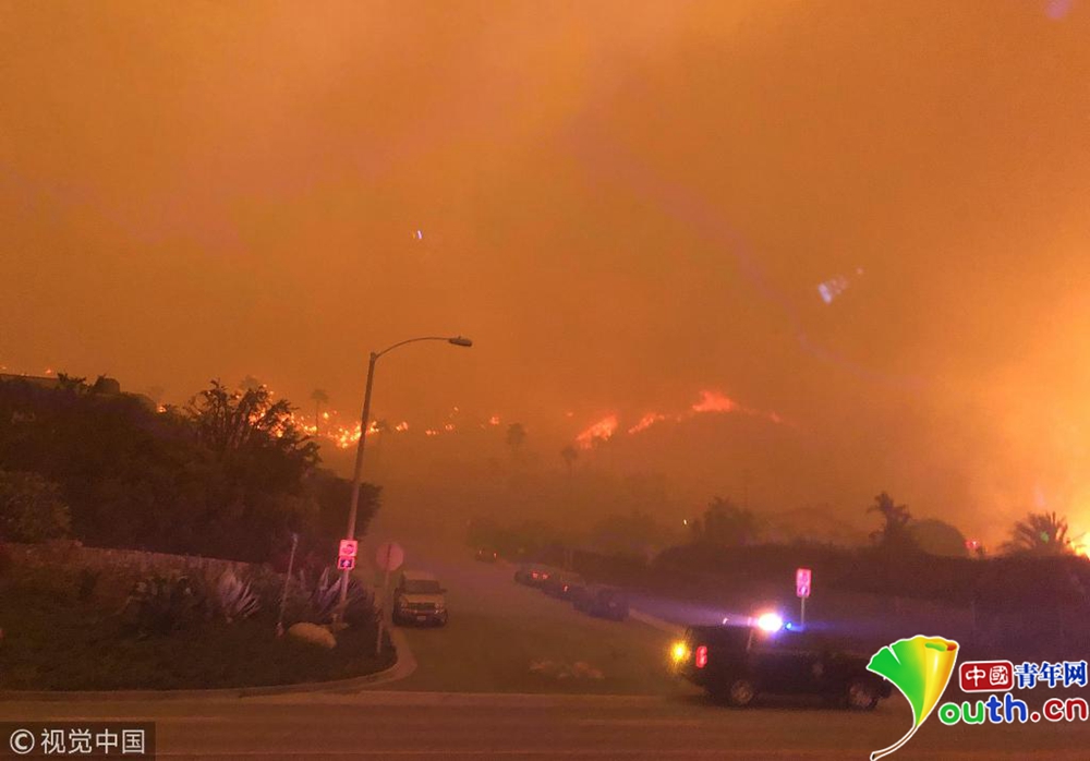 山火迅速蔓延至剛剛發(fā)生槍擊案的千橡樹市,并在9日翻過(guò)圣莫妮卡山,在強(qiáng)風(fēng)的助力下向海邊蔓延。