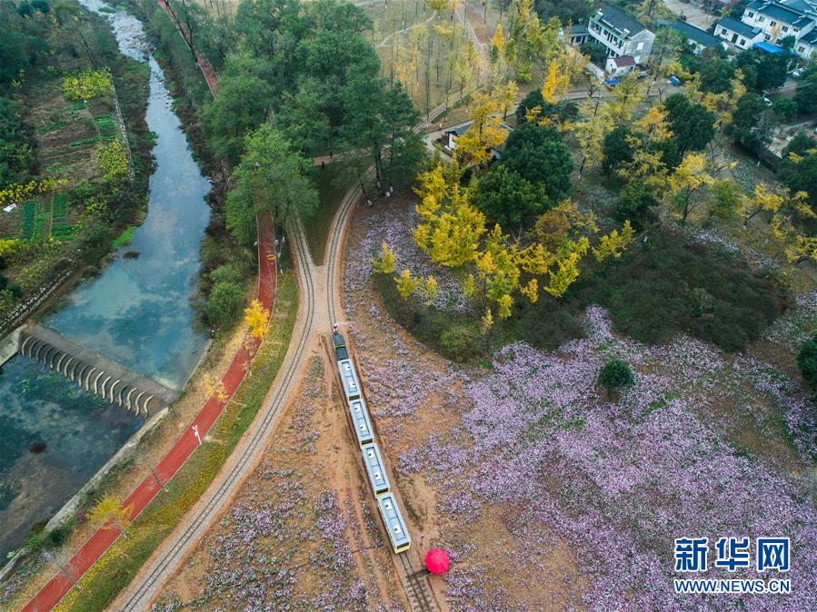 一列觀光小火車帶著游客穿行在銀杏林和花海之間(11月16日無人機拍攝)。近日,在浙江省長興縣小浦鎮(zhèn),“十里銀杏長廊”和近千畝花海經(jīng)過近一年的升級改造后,以嶄新的面貌與游客見面?;ê?、觀光小火車、古村民宿、銀杏長廊等旅游項目全面提升了小浦鎮(zhèn)鄉(xiāng)村旅游的品質(zhì)。新華社記者 徐昱 攝