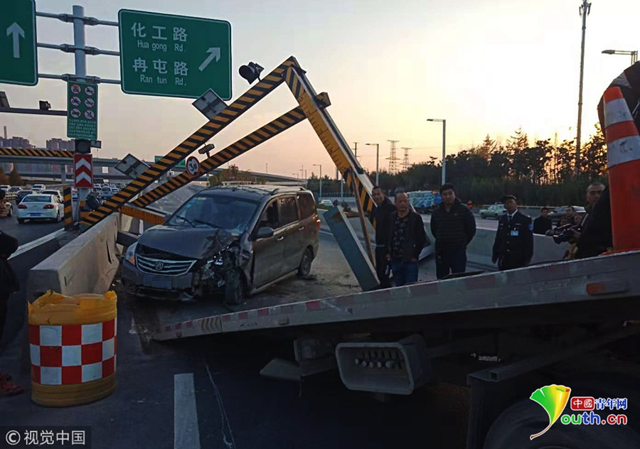 2018年11月19日下午,鄭州市西三環(huán)化工路立交橋,沿西三環(huán)由北向南方向上橋口處,一輛商務(wù)面包車失控撞塌了3米限高架,橋上交通瞬間中斷。 圖片來源:視覺中國(guó)