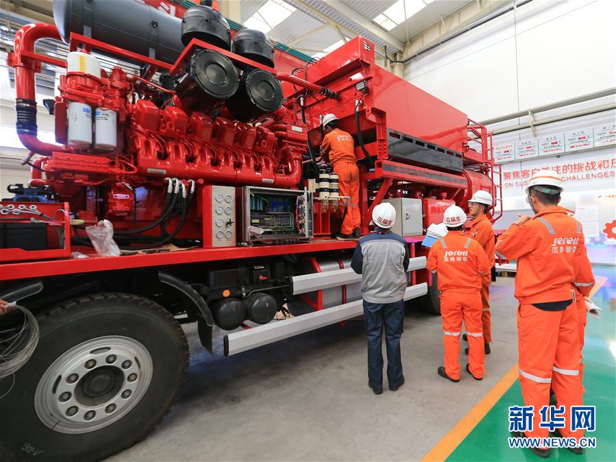 在杰瑞集團(tuán)石油裝備制造工業(yè)園,工作人員在對(duì)壓裂車進(jìn)行裝配(10月17日攝)。新華社記者王南攝