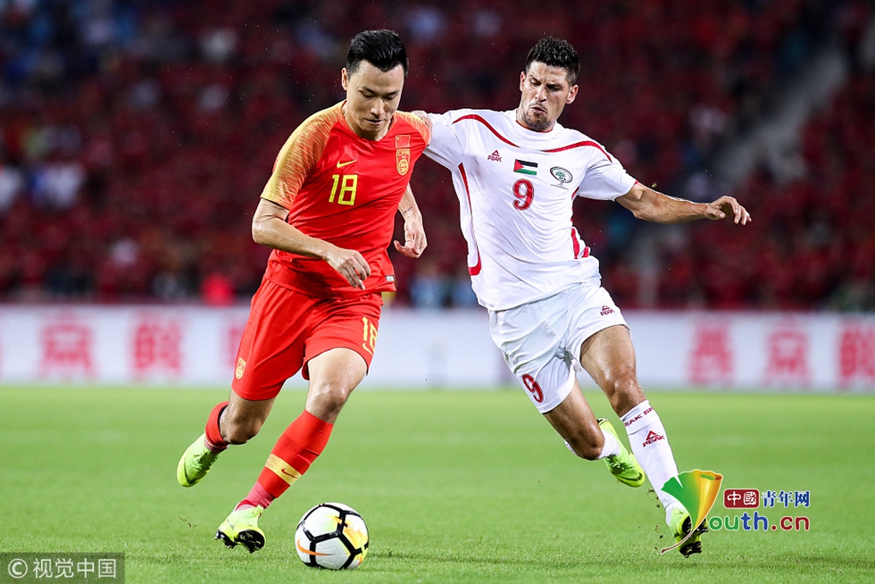 2018年11月20日,海口,2018國際足球友誼賽,中國男足Vs巴勒斯坦。郜林拼搶 圖片作者:null