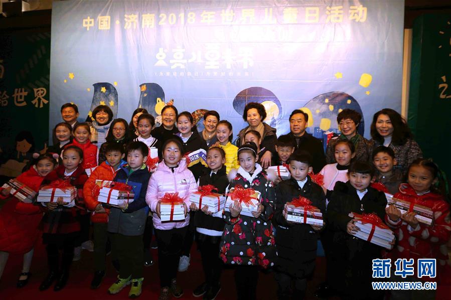 11月20日,在濟(jì)南舉行的世界兒童日主題活動(dòng)上,孩子們拿著獲贈(zèng)的經(jīng)典書(shū)籍合影留念。 新華社發(fā)(李俊卓攝)