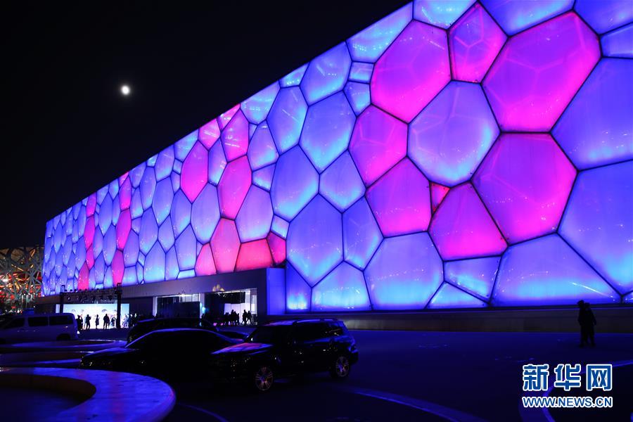 11月20日,在北京舉行的世界兒童日主題活動(dòng)上,國家游泳中心外墻被點(diǎn)亮。 新華社記者張玉薇攝