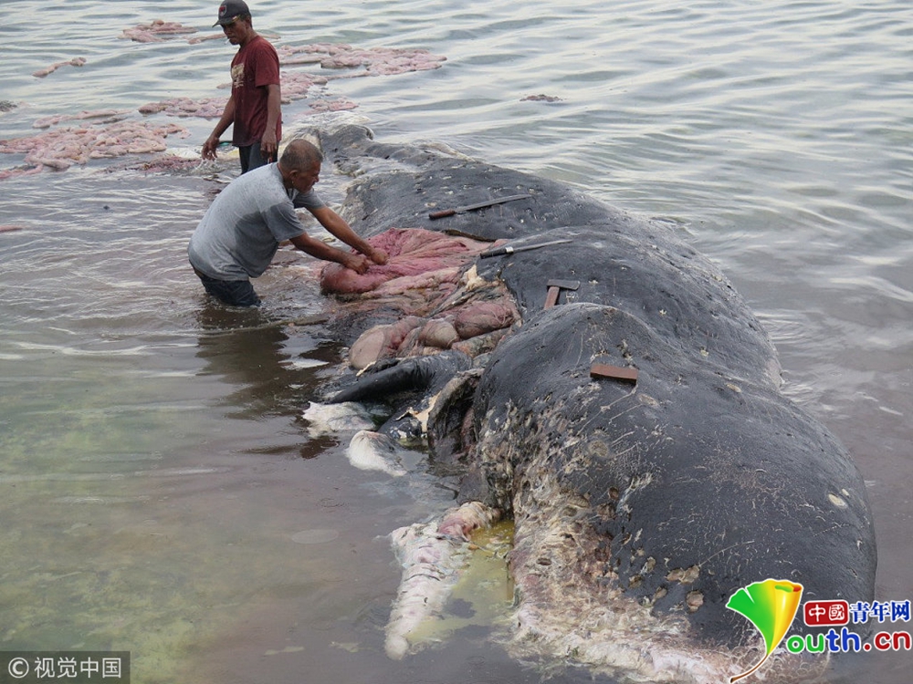 鯨魚擱淺印尼海岸 肚子里滿是塑料垃圾