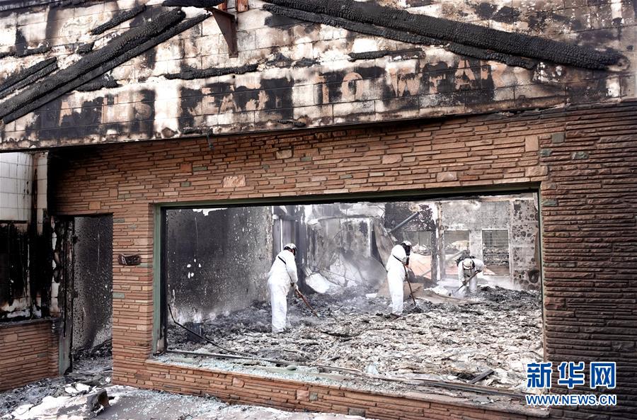11月20日,在美國(guó)加利福尼亞州比尤特縣天堂鎮(zhèn),救援人員在山火廢墟中工作。